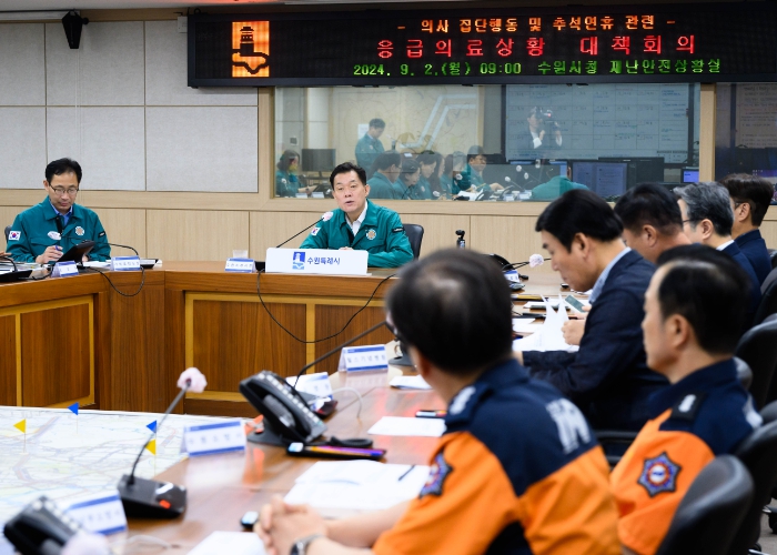 수원시가 2일 시청 재난안전상황실에서 연 ‘의료계 집단행동·추석 연휴 관련 응급의료상황 대책회의’를 주재한 이재준 시장은 “응급의료포털에서 비상진료를 하는 병의원·약국을 검색할 수 있지만, 포털에서 정보를 찾는 것을 어려워하는 시민도 많다”며 “누구나 쉽게 정보를 찾을 수 있도록, 연휴 기간에 진료하는 병의원을 물어볼 수 있는 전화번호도 안내하라”고 말했다.