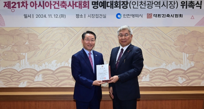 ▲ 유정복 인천광역시장이 12일 시청 대접견실에서 열린 '제21차 아시아건축사대회 명예대회장(인천광역시장) 위촉식'에서 김재록 대한건축사협회 회장에게 위촉패를 받고 있다. |