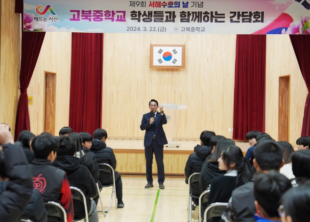 ▲ 이완섭 서산시장이 22일 고북중학교 체육관에서 학생들에게 서해수호의 날의 의미와 중요성을 설명했다. |