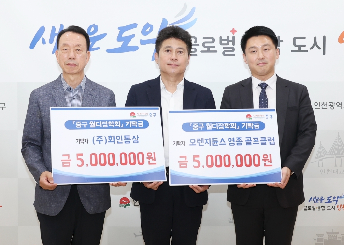 [뉴스서울] 인천 중구 월디장학회는 ‘㈜화인통상’과 ‘오렌지듄스 영종 골프클럽’으로부터 각 500만 원씩 총 1,000만 원의 장학금을 기탁받았다고 6일 밝혔다.