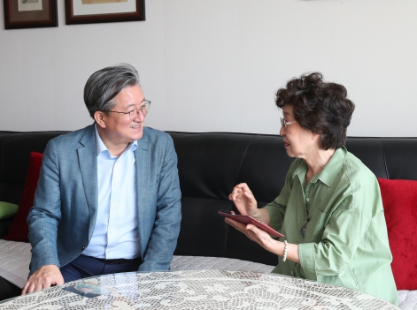 ▲ 13일 정용래 유성구청장이 광복절을 맞아 조국 독립을 위해 헌신하신 故 김찬선 애국지사의 자녀인 김정자 씨 가정을 방문해 감사의 마음을 전하고 있다. |