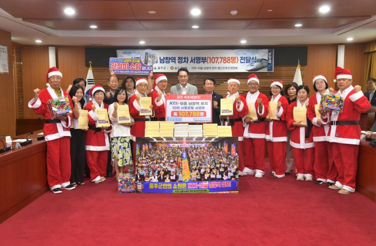[뉴스서울] 울주군 KTX-이음 남창역 정차 범군민추진위원회가 6일 군청 이화홀에서 이순걸 울주군수에게 KTX-이음 남창역 정차를 염원하는 울주군민 10만7천788명의 서명부를 전달했다.
