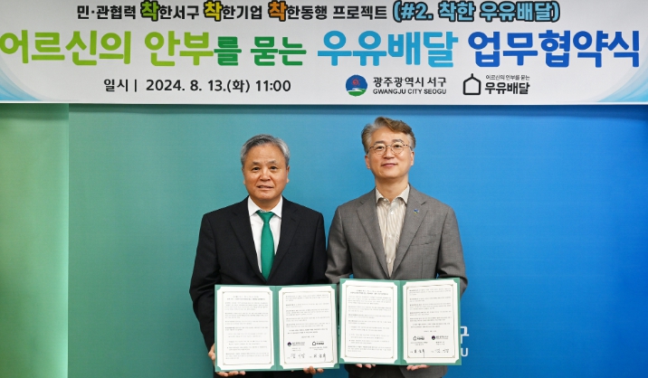 [뉴스서울] 광주광역시 서구가 (사)어르신의 안부를 묻는 우유배달(이사장 호용한)과 ‘민관협력 착착착(착한서구 착한기업 착한동행) 프로젝트’를 위해 손을 맞잡았다. 양 기관은 13일 취약계층 독거 어르신의 고독사를 예방하기 위한‘착한 우유배달’업무협약을 체결했다.