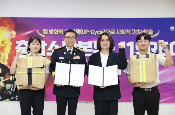업사이클링은 재활용할 수 있는 옷이나 의류 소재에 디자인과 활용성을 더해 가치를 높이는 일로, 이번 협약은 대부분 폐기·소각되는 폐방화복 중 상태가 양호한 방화복을 재활용하기 위해 마련됐다.