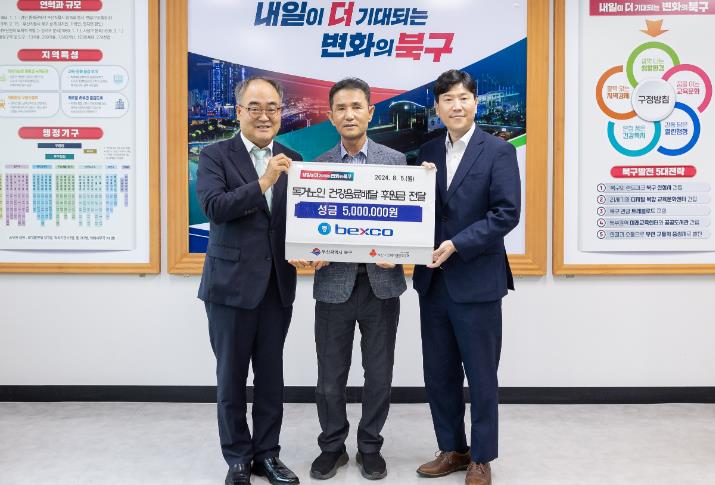 [뉴스서울] ㈜벡스코는 지난 5일, 부산 북구청을 방문하여 ‘독거노인 사랑의 건강음료 배달사업’에 사용해 달라며 후원금 500만원을 전달했다.