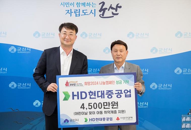 [뉴스서울] 1일 HD현대중공업은 5월 어린이의 달을 맞아 군산시 취약계층 아동 후원을 위해 성금 4,500만원을 기탁했다.