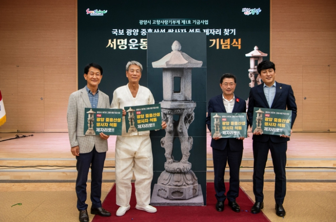 [뉴스서울] ‘광양시 고향사랑기부제 제1호 기금사업’에 선정된 ‘국보 광양 중흥산성 쌍사자 석등 제자리 찾기 서명운동’이 제자리 찾기 추진위원회, 사회단체, 시민들의 적극적인 동참으로 6개월 만에 5만 명을 달성하는 대기록을 썼다.