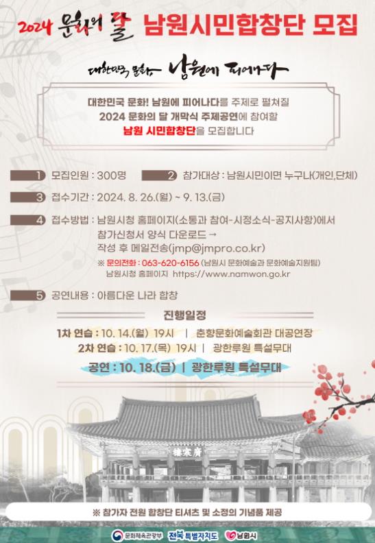 “대한민국 문화! 남원에 피어나다”를 주제로 펼쳐질 2024 문화의 달 행사 개막식 주제공연에 참여할 ‘300인의 남원시민합창단’이 바로 그것이다.
