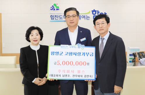 [뉴스서울] 함양군을 사랑하는 마음을 담아 남영조 주식회사 불스 대표이사와 김인숙 전무이사가 함양군 고향사랑기부제에 고액(500만 원)의 기부금을 전달했다.