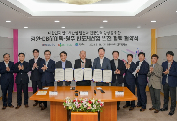 [뉴스서울] 강원특별자치도·원주시·DB하이텍은 26일 충청북도 음성군에 있는 DB하이텍 상우캠퍼스에서 업무 협약을 체결하며 반도체산업 발전과 전문인력 양성을 위해 힘을 합치기로 했다.