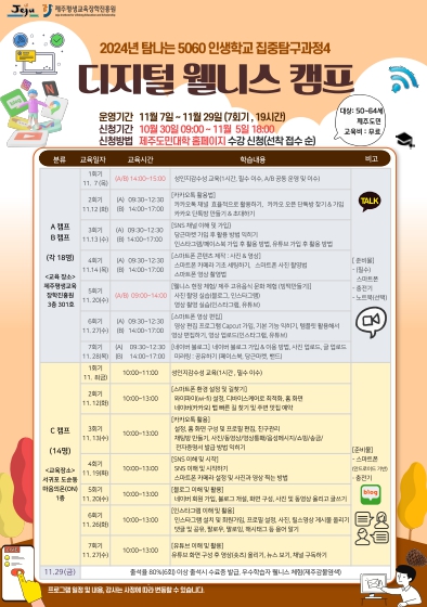 (재)제주평생교육장학진흥원(원장 진희종)이 제주도민 만 50세 부터만 64세를 대상으로 ‘탐나는 5060 디지털 웰니스 캠프’ 교육생을 모집한다.