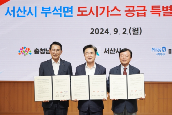 시는 2일 충남도청에서 이완섭 서산시장, 김태흠 충남도지사, 박영수 미래엔서해에너지 대표 등이 참석해 ‘소외지역 도시가스 공급 특별지원 업무협약’을 체결했다고 밝혔다.