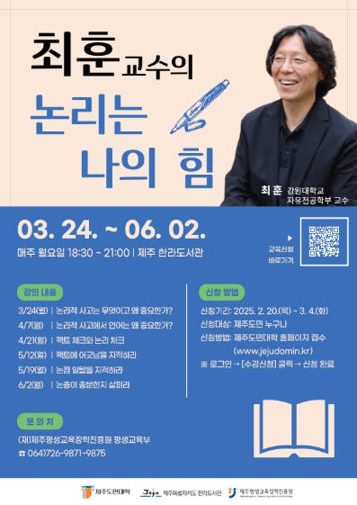 [뉴스서울] 제주특별자치도 한라도서관은 제주도민대학과 공동으로 강원대학교 최훈 교수를 초청해 「논리는 나의 힘」을 주제로 도민 강좌를 24일부터 운영한다.