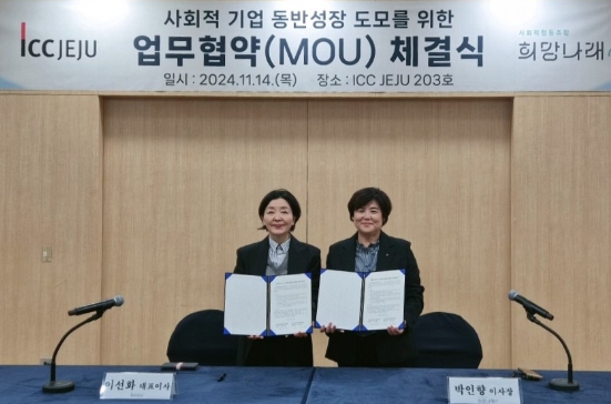 [뉴스서울] 제주국제컨벤션센터는 14일 오후 2시 ICC JEJU 203호에서 양 기관 대표자가 참석한 가운데 사회적협동조합 희망나래와 ‘사회적가치 및 사회적경제 활성화를 위한 업무협약’을 체결했다고 밝혔다.