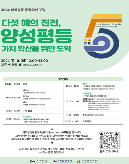 [뉴스서울] 제주여성가족연구원 제주양성평등교육센터은 11월 5일 오전 10시 제주썬호텔 3층에서 “다섯 해의 진전, 양성평등 가치확산을 위한 도약”이란 주제로 2024 양성평등 문화확산 포럼을 개최한다.