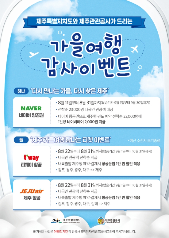 가을 여행 시즌을 맞아 하반기 제주 관광 수요를 선제적으로 견인하고, 제주를 방문하는 관광객의 항공비 부담을 완화하기 위해 시행하는 이번 프로모션은 오는 9월 1일부터 10월 31일까지 제주를 방문하는 내국인 관광객을 대상으로 진행하고 있다.