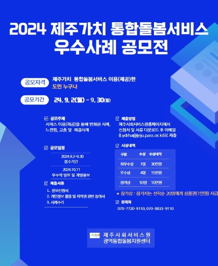 문원일 제주특별자치도사회서비스원장은 “제주가치통합돌봄 서비스를 실제로 이용한 도민, 서비스를 제공한 제공인력의 생생한 목소리를 통해 도민이 체감하는 돌봄서비스가 제공될 수 있도록 공모전에 적극적인 참여를 부탁드린다”고 전했다.