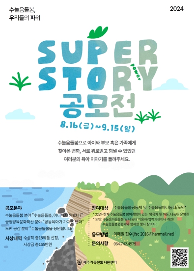 [뉴스서울] 제주가족친화지원센터는 수눌음돌봄문화 및 긍정양육 문화를 확산하기 위해 오는 8월 16일부터 『2024 SUPER(수눌음돌봄, 우리들의 파워) 스토리』공모전을 개최한다.
