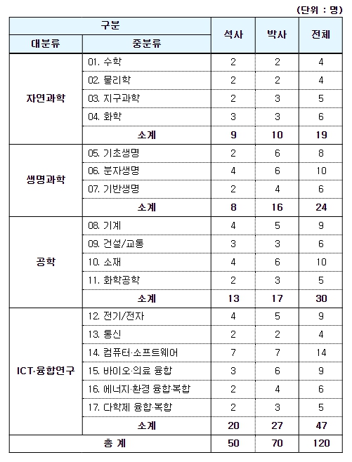 분야별 선발인원은 신청 접수 인원에 비례 배분하여, 대분류 기준으로 △자연과학 총 19명(석사 9명, 박사 10명), △생명과학 총 24명(석사 8명, 박사 16명), △공학 총 30명(석사 13명, 박사 17명), △ICT‧융합연구 총 47명(석사 20명, 박사 27명)을 선발했다.