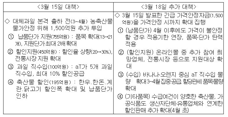 ① 납품단가 지원 관련, 3월 18일부터 지원품목을 기존 13개에서 21개로 확대하고, 지원단가도 품목별로 최대 2배까지 확대 적용하고 있다. 농산물 납품단가 지원으로 유통업체의 판매 정상가격이 낮아져 소비자의 물가 불안심리를 낮추는 효과가 있으며, 유통업체 자체할인과 정부 할인지원 30%까지 더해질 경우 소비자 물가 부담이 더욱 완화되는 효과가 발생할 것으로 기대된다.