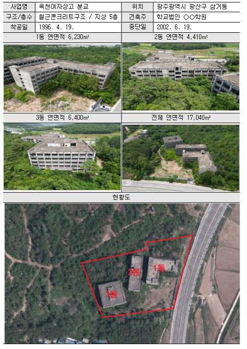 국민권익위의 조사 결과, ㄱ학교법인은 1996년 광주광역시 교육청으로부터 학교시설사업을 허가받아 광주광역시 광산구에 건축물 3개동을 짓던 중 골조공사까지 완료된 상태에서 2002년 학교시설사업 및 건축허가가 취소됐고, 건축물은 그 상태로 현재까지 방치됐다.