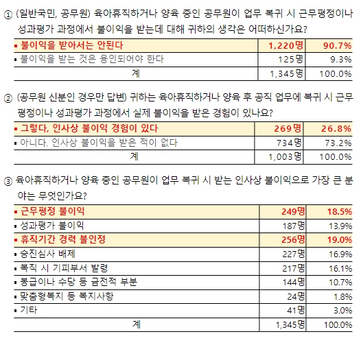 육아휴직자 소속부서는 인력 누수에 따른 대체인력 확보가 쉽지 않고, 육아휴직 복귀자・양육의무자들은 조직 필요성 등을 이유로 기피부서나 원거리 위치부서로 발령받는 등 복직 전 안내도 미흡해 업무 적응과 육아를 병행하기 어렵다는 등 불만 의견이 많았기 때문이다.