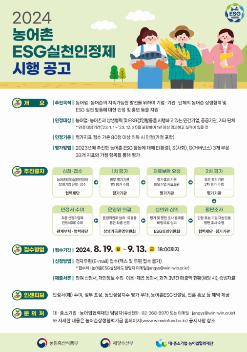 [뉴스서울] 농림축산식품부, 해양수산부, 대·중소기업·농어업협력재단(김영환 사무총장)은 농어촌 환경·사회·투명경영(ESG) 활동에 기여한 우수 기업·기관을 인정하고 홍보하기 위한 ‘2024년 농어촌 환경·사회·투명경영(ESG) 실천인정제’를 시행한다고 밝혔다.