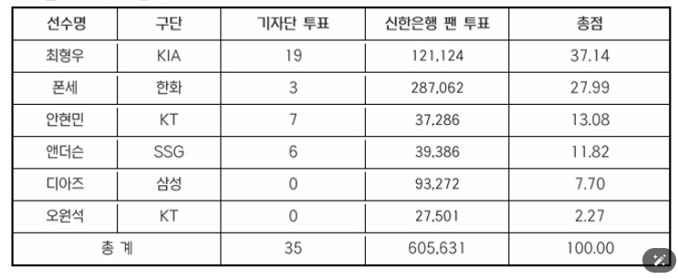 기자단 투표 총 35표 중 19표(54.3%), 팬 투표 60만 5,631표 중 12만 1,124표(20%)로 총점 37.14점을 받은 최형우는 기자단 투표 3표, 팬 투표 28만 7,062표로 총점 27.99점을 기록한 한화 폰세를 제치고 5월 월간 MVP로 선정됐다.