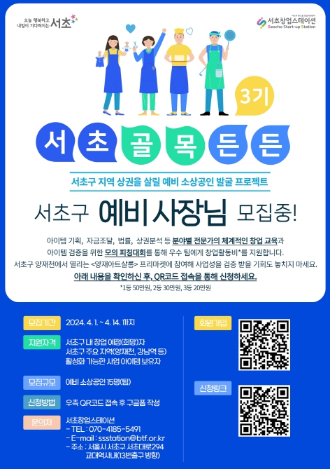 신청기간은 이번 14일까지로, 사업 아이템과 추진 계획을 가진 서초구의 예비 창업가라면 누구나 신청할 수 있다. 총 15명(팀)을 모집하며, 대회를 통해 우수 예비 골목 사장님으로 선정된 3명(팀)에게는 소정의 창업활동비를 지원한다.