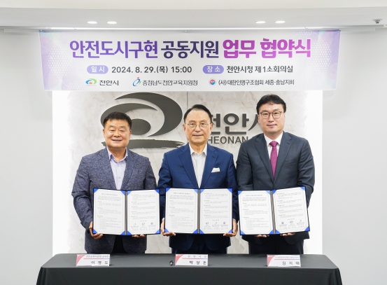 [뉴스서울] 천안시는 29일 천안교육지원청, 민간인명구조단체인 (사)대한인명구조협회 세종·충남지회와 안전도시 구현을 위한 공동지원 업무협약을 체결했다고 밝혔다.