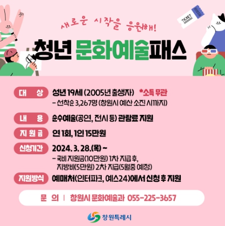 [뉴스서울] 창원특례시는 오는 28일부터 19세 청년(2005년 출생자)을 대상으로 청년 문화예술패스 사업을 실시한다고 밝혔다.