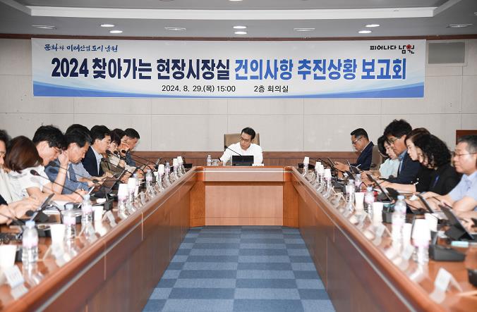 [뉴스서울] 최경식 남원시장은 29일 시청 회의실에서 지난 7월 한달간 계속된 ‘찾아가는 현장시장실’에서 제안된 299건의 건의 사항에 대해 소관 부서장과 읍면동장이 참석한 가운데 추진상황 보고를 듣고 시민과의 소통 현황을 점검했다.