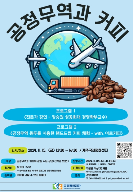 [뉴스서울] 국제평화재단은 11월 15일 제주국제평화센터 1층 제주 국민외교센터에서 진행 예정인‘공정무역과 커피’ 프로그램 참가자를 모집한다.