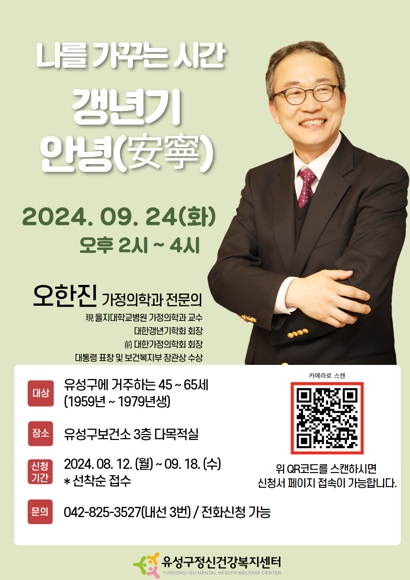 이번 강연은 유성구 정신건강복지센터 주관으로 진행되며, 모집 대상은 신체와 정신에 급격한 변화를 겪는 갱년기(45~65세) 주민이다.