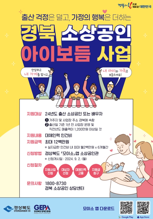 경상북도는 전국 처음으로 소상공인의 출산과 육아로 인한 경제적 부담을 덜어주고, 안정적인 사업 환경을 조성하기 위해 출산 후 6개월간 최대 1,200만원까지 지원하는 ‘소상공인 출산 지원 아이보듬지원사업’을 9월 2일부터 본격적으로 시행한다.