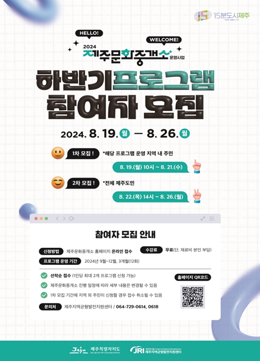 [뉴스서울] 제주특별자치도는 도민 누구나 도내 어디서든 문화여가 프로그램을 즐길 수 있도록 마련한 ‘제주문화중개소’ 사업의 2024년 하반기 프로그램 참가자를 오는 26일까지 모집한다.