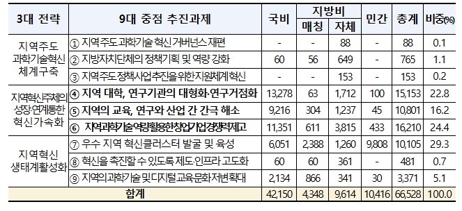 ’25년에는 총 6조 6,528억 원(중앙정부 5조 6,914억 원, 지자체 9,614억 원)을 투입하여, 창업·기업 경쟁력 제고(1조 6,210억 원), 지역 대학·연구기관의 거점화(1조 5,153억 원), 지역 교육 및 산업 활성화(1조 801억 원) 등에 주로 투자할 예정이다.