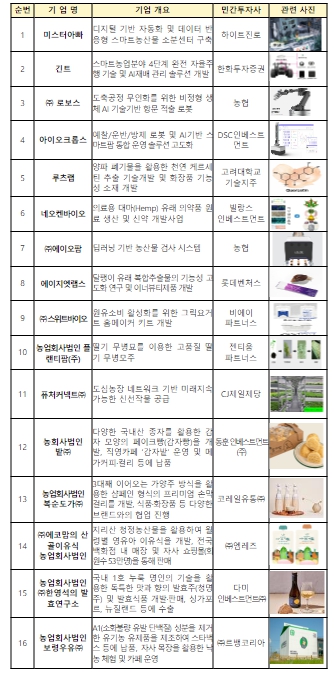 [뉴스서울] 농림축산식품부는 4월 26일, 2024년 신규사업인 「민간투자기반 스케일업 지원」에 (㈜미스터아빠, ㈜긴트, ㈜로보스, 농업회사법인 아이오크롭스㈜, ㈜루츠랩, ㈜네오켄바이오, ㈜에이오팜, ㈜에이지엣랩스, ㈜스위트바이오, 농업회사법인 플랜티팜㈜, 퓨처커넥트㈜), 농업회사법인 밭㈜, 농업회사법인 복순도가㈜, ㈜에코맘의 산골이유식 농업회사법인, 농업회사법인 ㈜한영석의 발효연구소, 농업회사법인 보령우유㈜ 16社를 최종 선정했다.