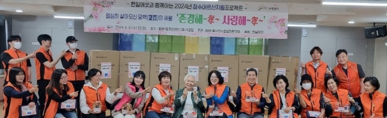 장수 3종 선물세트를 전달받으신 어르신께서는 “너무 예쁜 카네이션 설기를 받아 기뻤고, 꼭 필요한 수복(壽福)수저세트를 주셔서 매일 식사할때마다 오늘이 기억될 수 있 뜻깊은 어버이날을 선물해주어 감사하다”고 말했다.