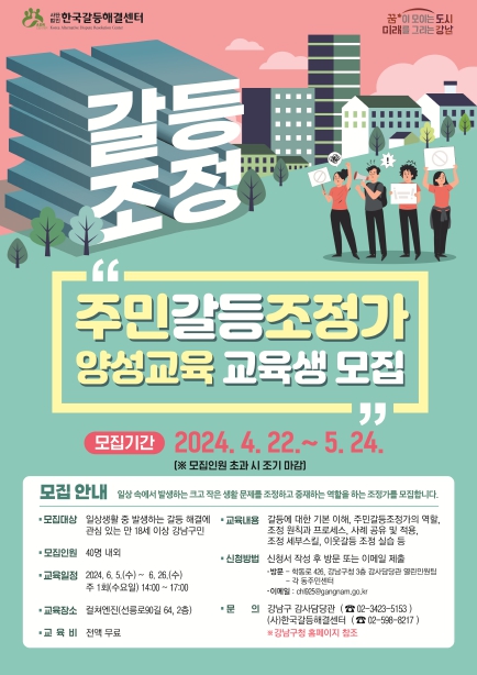 [뉴스서울] 꿈이 모이는 도시, 미래를 그리는 강남구가 일상생활에서 발생하는 갈등 해결에 관심 있는 구민을 대상으로 주민갈등조정가 양성 교육을 실시하고 다음달 24일까지 교육생 40명을 모집한다.