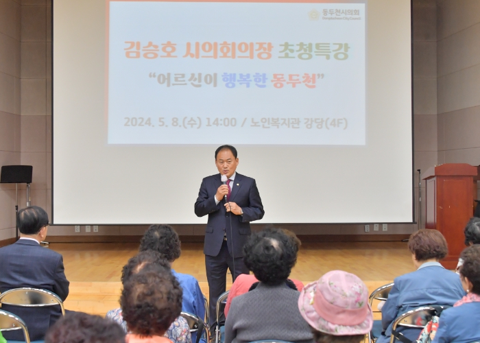 [뉴스서울] 동두천시의회 김승호 의장은 지난 5월 8일, 동두천시 노인복지관에서 열린 어버이날 행사에서 '어르신이 행복한 동두천'이라는 제목으로 특강을 진행했다.