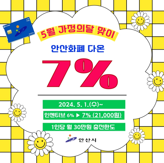 [뉴스서울] 안산시는 오는 5월 가정의 달을 맞아 안산 지역화폐 다온의 인센티브를 기존 6%에서 7%로 1%p 상향 조정한다고 27일 밝혔다.