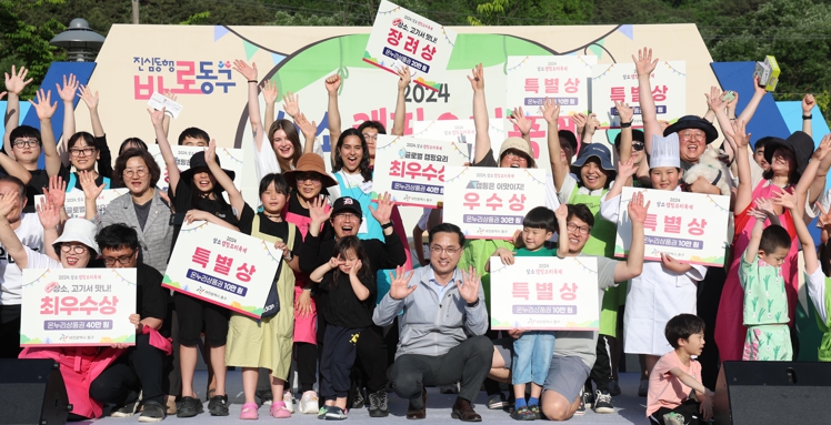 | ▲ 박희조 동구청장이 18일 상소오토캠핑장에서 열린 2024 상소캠핑요리축제에서 요리대회 시상식이 끝난 뒤 참가자들과 기념 촬영을 하고 있다. |