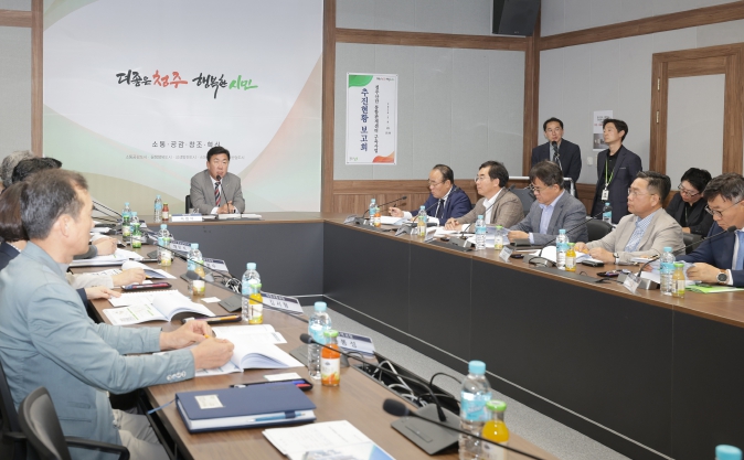 이범석 청주시장, 박진순 한국국토정보공사 공간정보사업처장, 참여기관 컨소업체 대표, 사업관련 부서장 등 14명이 참석한 가운데 열린 이날 보고회는 구축사업 추진현황 발표, 관계부서 의견수렴 및 질의응답 순으로 진행됐다.