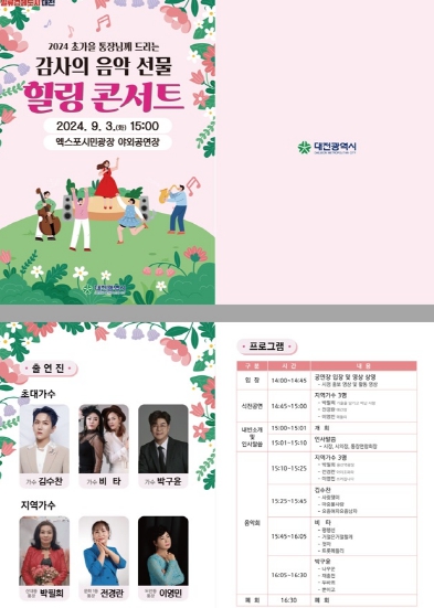 [뉴스서울] 대전시는 9월 3일 엑스포시민광장 야외공연장에서 5개 구 2,600여 명의 대전시 전체 통장들이 참석하는 ‛2024 감사의 음악 선물, 힐링 콘서트'를 개최한다.