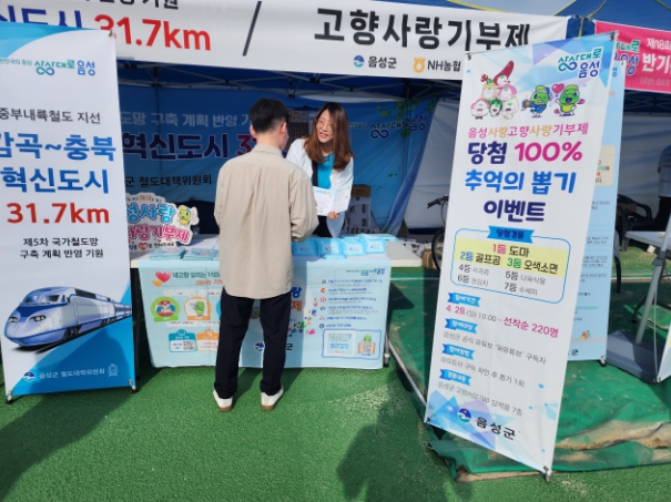 이날 고향사랑기부제 홍보부스를 운영해 마라톤 참가자 등 방문객에게 추억의 뽑기 이벤트를 실시하며, 고향사랑기부제 음성군 답례품을 경품으로 제공하고 이 제도의 취지, 기부 혜택 등을 설명했다.