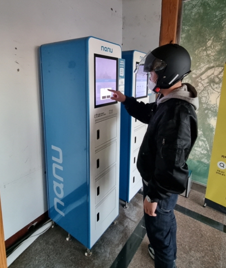 ▲ 경주 황리단길 전기이륜차 배터리 공유 스테이션에서 전기 바이크 이용자가 직접 배터리를 교환하고 있다. |