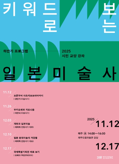 제주도립미술관은 11월 12일부터 12월 17일까지 수요일 오후 2~4시 미술관 강당에서 ‘2025 시민 교양 강좌’ 하반기 프로그램 '키워드로 보는 일본미술사'를 운영한다.