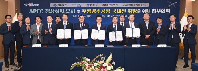 [뉴스서울] 경상북도는 14일 도청 사림실에서 포항시, 경주시, 한국공항공사 포항경주공항, 경상북도문화관광공사와 함께 2025 APEC 경주 유치 지원과 포항경주공항 국제선 부정기편 운항을 위한 업무협약을 체결했다.