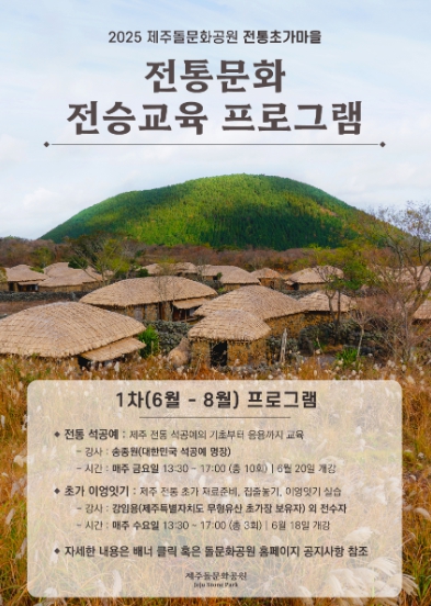 [뉴스서울] 제주특별자치도 돌문화공원관리소는 6월부터 8월까지 공원 내 전통초가마을(돌한마을)에서‘전통문화 전승교육 프로그램’을 운영한다.